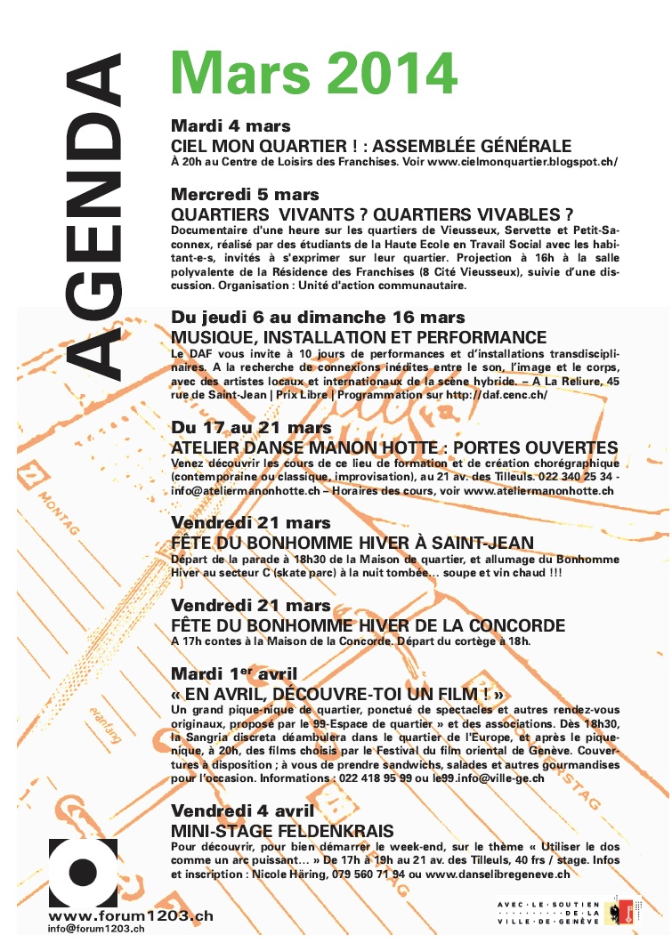 Partager cette page Infos quartier | Mars 2014 publié le 1er avril 2014, actualisé le 1er avril 2014 par Nicolas Infos quartier Associations 1203 Activités Vie socioculturelle 2014 03 Agenda Portfolio Documents joints 2014 03 AgendaTélécharger 1er avril 2014 - PDF - 475.2 ko 2014 03 Infosquartier Télécharger 1er avril 2014 - PDF - 582.3 ko