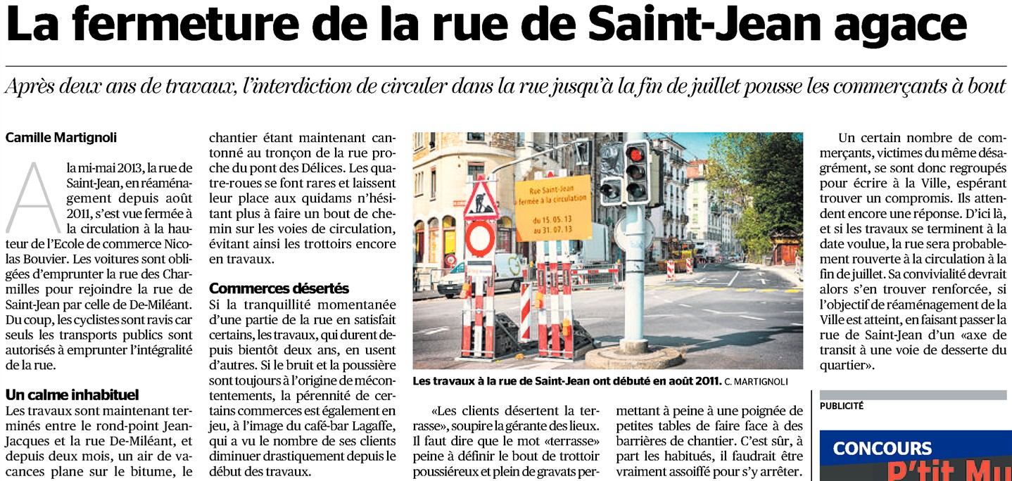 Partager cette page La fermeture de la rue de Saint-Jean agace publié le 17 juillet 2013, actualisé le 17 juillet 2013 par Paolo Saint-Jean Lire la suite de l’article paru dans la Tribune de Genève | Mercredi 17 juillet | Camille Martignoli | page 20 Rue_St-Jean_TDG_17-07-2013_p20 Rue St-Jean | Tribune de Genève | Mercredi 17 juillet | Camille Martignoli | page 20