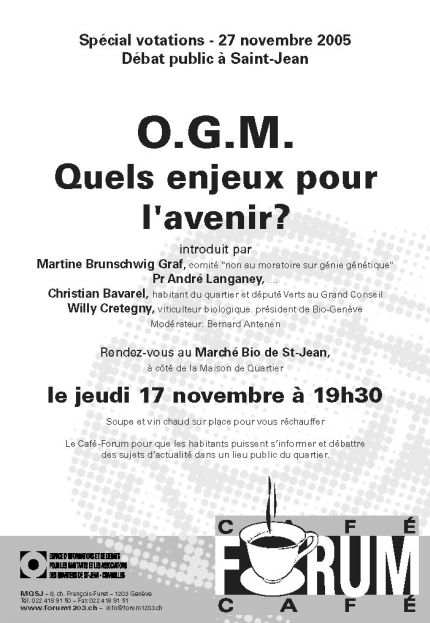 Jeudi 17 novembre 2005 à 19h.30 le Forum St-Jean/Charmilles invite les habitants du quartiers et les clients du marché Bio à débattre sur la question des O.G.M. dans le cadre de la votation du 27 novembre.